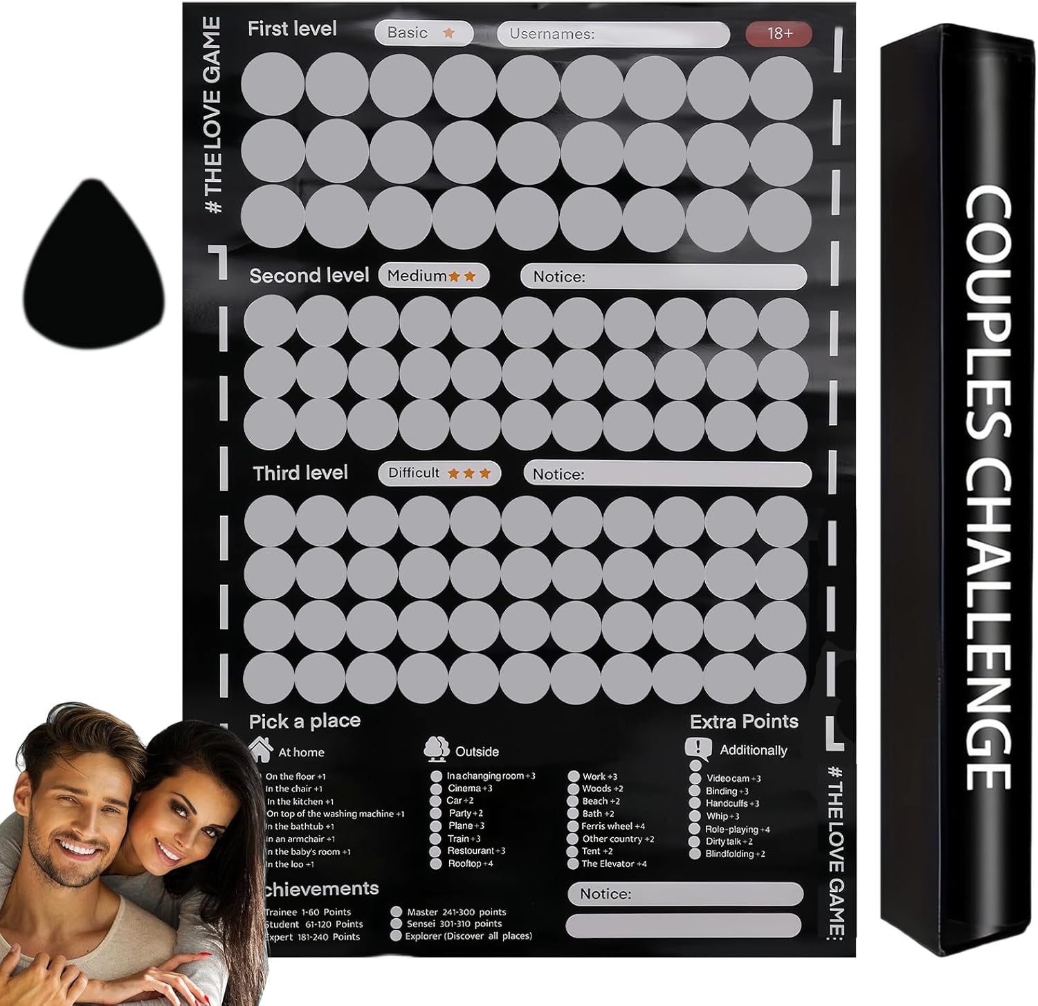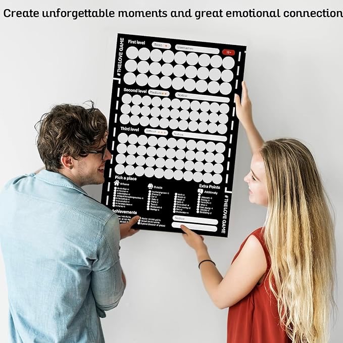 Posterul LOVEQUEST include peste 100 de întâlniri creative și provocări pentru cupluri, fiecare ascunsă sub un strat auriu răzuibil. Fie că ești la începutul relației sau sunteți împreună de ani de zile, aceste sarcini vă ajută să vă reconectați, să vă distrați și să aduceți mai multă pasiune în rutina voastră.